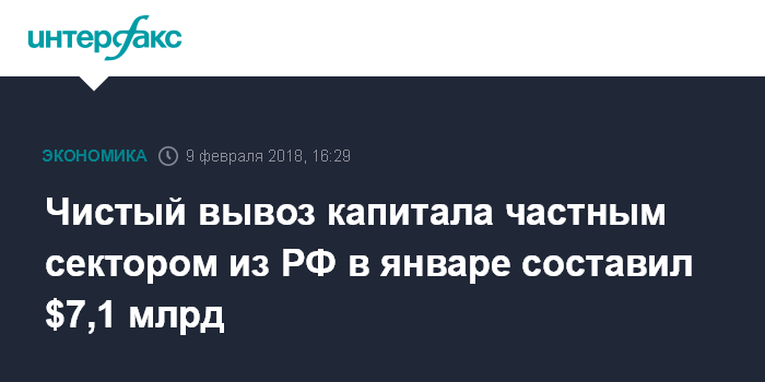 Москва. 9 февраля. INTERFAX.RU - Чистый вывоз капитала частным сектором из России в январе 2018 года, по предварительной оценке, составил $7,1 млрд, что в 2,3 раза превышает аналогичный показатель января 2017 года ($3,1 млрд), сообщается в информации на сайте ЦБ РФ.
