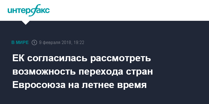 Москва. 9 февраля. INTERFAX.RU - Европейская комиссия готова к рассмотрению вопроса о ситуации с переходом на летнее время, заявила в пятницу на брифинге в Брюсселе официальный представитель ЕК Мина Андреева.