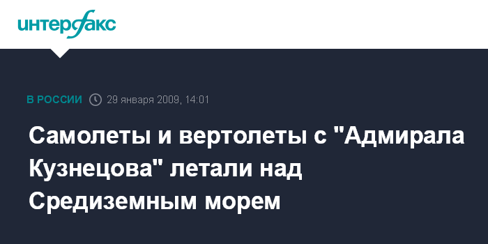 Москва. 29 января. INTERFAX.RU - Палубная авиация тяжелого авианесущего крейсера "Адмирал Кузнецов" выполнила в Средиземном море полеты в рамках дальнего похода, сообщил "Интерфаксу" в четверг помощник главкома ВМФ РФ Игорь Дыгало.
