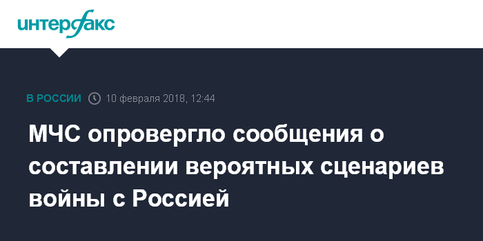 Москва. 10 февраля. INTERFAX.RU - МЧС не занимается прогнозами сценариев ведения военных конфликтов, так как это не относится к компетенции министерства, сообщили в пресс-службе МЧС РФ. Ранее некоторые СМИ сообщили, что в МЧС назвали наиболее вероятные сценарии войны с Россией, согласно которым применение оружие массового поражения маловероятно.