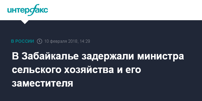 Москва. 10 февраля. INTERFAX.RU - В Забайкалье задержан министр сельского хозяйства и его заместитель за превышение должностных полномочий, сообщила "Интерфаксу" официальный представитель МВД России Ирина Волк.
