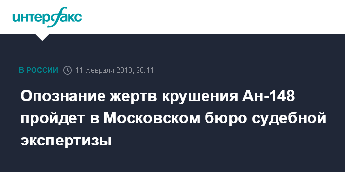 Москва. 11 февраля. INTERFAX.RU - Процесс опознания тел погибших в результате крушения Ан-148 и судебной экспертизы будет проводиться в Московском бюро судебной экспертизы, сообщил заместитель мэра столицы Леонид Печатников "Интерфаксу".