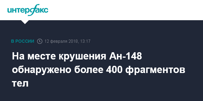 Москва. 12 февраля. INTERFAX.RU - Более 400 фрагментов тел погибших обнаружено в ходе поисковой операции на месте крушения самолета Ан-148 в Раменском районе Подмосковья, сообщили в МЧС России.