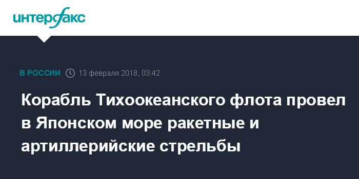 Москва. 13 февраля. INTERFAX.RU - Большой противолодочный корабль Тихоокеанского флота (ТОФ) "Адмирал Виноградов" провёл ракетные и артиллерийские стрельбы в Японском море, сообщил начальник отдела информационного обеспечения пресс-службы Восточного военного округа по ТОФ капитан второго ранга Николай Воскресенский.