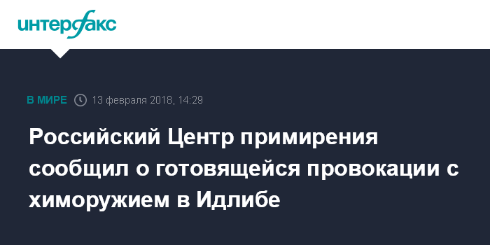 "Вечером 12 февраля в российский Центр примирения враждующих сторон поступил телефонный звонок от жителя населенного пункта Серакаб, провинция Идлиб, о готовящейся провокации с использованием отравляющих химических веществ для показа в эфире иностранного телеканала. По словам звонившего, днём 12 февраля боевики группировки "Джабхат ан-Нусра" (запрещена в РФ - ИФ) тремя автомобилями завезли в Серакаб более 20 баллонов с хлором и средства индивидуальной защиты", - говорится в сообщении Центра.