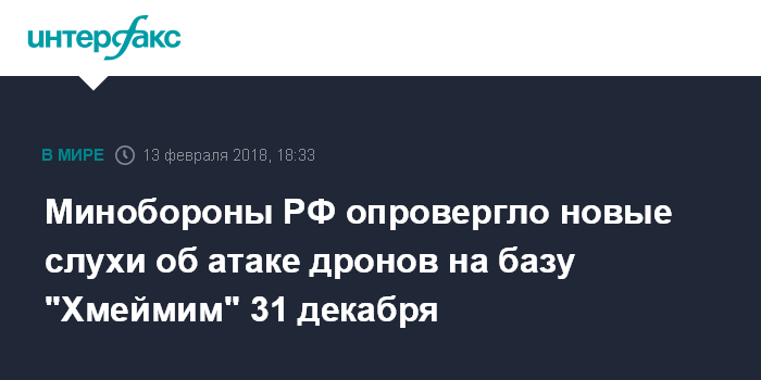 Москва. 13 февраля. INTERFAX.RU - Сообщения СМИ об атаке беспилотников на российскую авиабазу "Хмеймим" в Сирии 31 декабря не соответствуют действительности, сообщили во вторник в Министерстве обороны России.