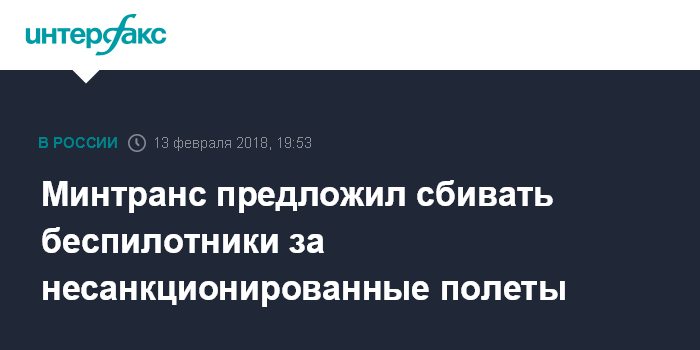 Москва. 13 февраля. INTERFAX.RU - Минтранс РФ предлагает сбивать беспилотники за несанкционированное использование воздушного пространства. О подготовке соответствующего законопроекта министерство уведомило на сайте regulation.gov.ru.