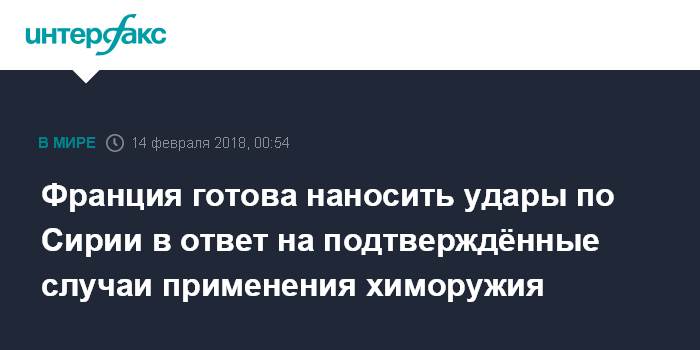 Москва. 14 февраля. INTERFAX.RU - Президент Франции Эммануэль Макрон подтвердил готовность его страны нанести удары по объектам в Сирии, если поступят достоверные данные о применении Дамаском химоружия, предают парижские СМИ.