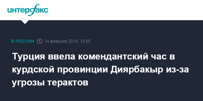 Москва. 14 февраля. INTERFAX.RU - Турецкие власти ввели комендантский час в десятках деревень и городов в населенной преимущественно курдами провинции Диярбакыр в связи с террористической угрозой, передают западные СМИ.