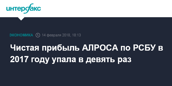 Москва. 14 февраля. INTERFAX.RU - Чистая прибыль ПАО АК "АЛРОСА" по РСБУ в 2017 году упала в 8,7 раза, до 16,854 млрд рублей, следует из документов компании.