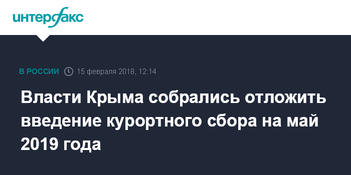 Москва. 15 февраля. INTERFAX.RU - Власти Крыма инициировали внесение изменений в региональный закон о введении курортного сбора в регионе, предлагают отложить всё на год - с мая 2018 на май 2019 года, сообщил министр курортов и туризма республики Вадим Волченко.