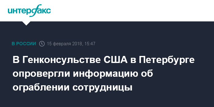 Москва. 15 февраля. INTERFAX.RU - Генеральное консульство США в Санкт-Петербурге опровергает информацию об ограблении сотрудницы дипломатического представительства.