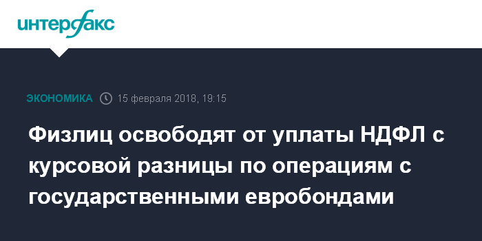 Москва. 15 февраля. INTERFAX.RU - Министерство финансов РФ готовит законопроект, который освободит граждан от уплаты НДФЛ с доходов от курсовой разницы при совершении операций с государственными евробондами, сообщил журналистам замминистра финансов РФ Илья Трунин.