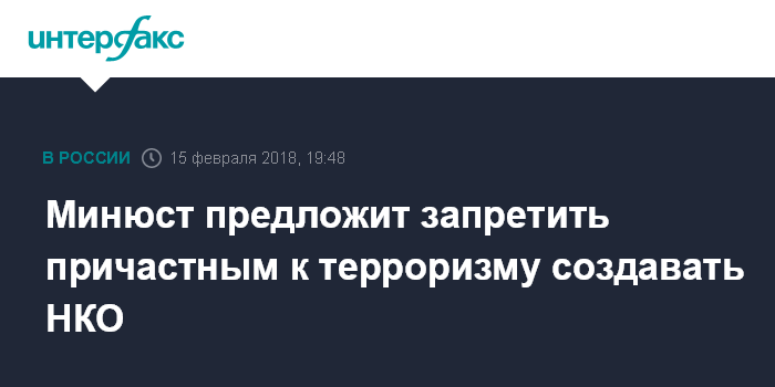 Москва. 15 февраля. INTERFAX.RU - Минюст России разрабатывает законопроект, согласно которому подозреваемым в причастности к террористической деятельности запретят создавать некоммерческие организации, сообщили в министерстве.
