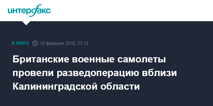 Москва. 15 февраля. INTERFAX.RU - Два разведывательных самолета британских Королевских ВВС Великобритании в четверг провели активную разведку по периметру границ Калининградской области, следует из мониторинговых данных западных авиационных ресурсов.