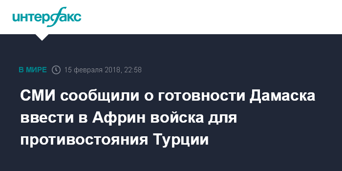 Москва. 15 февраля. INTERFAX.RU - Представители курдского ополчения - Отряда народной самообороны - договорились с Дамаском о введении правительственных войск на территорию Африна на севере Сирии, чтобы противостоять военной операции Турции "Оливковая ветвь", сообщили в четверг источники арабского телеканала "Аль-Маядин".