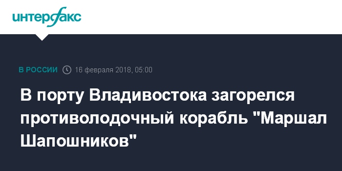 Москва. 16 февраля. INTERFAX.RU - Пожар тушат на борту большого противолодочного корабля "Маршал Шапошников", который стоит в ремонте в порту Владивостока, сообщили агентству "Интерфакс" во Владивостокском спасательном координационном центре (СКЦ)