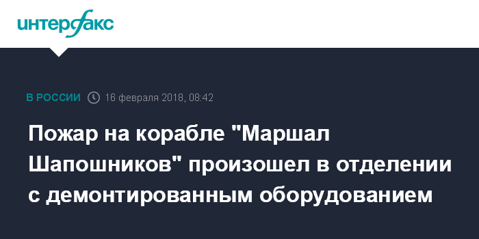 Москва. 16 февраля. INTERFAX.RU - Возгорание на корабле Тихоокеанского флота "Маршал Шапошников" произошло во время сварочных работ в одном из помещений машинного отделения, где не было важного оборудования, сообщил "Интерфаксу" в пятницу источник в судостроительной отрасти.