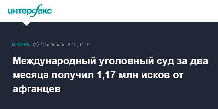 Москва. 16 февраля. INTERFAX.RU - Около 1,17 млн исковых заявлений подали граждане Афганистана в Международный уголовный суд (МУС), назвав себя жертвами военных преступлений, сообщает в пятницу агентство Associated Press.