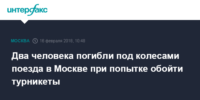 Москва. 16 февраля. INTERFAX.RU - Двое мужчин погибли под колесами электрички в Москве, проводится проверка, сообщили "Интерфаксу" в пресс-службе транспортного управления МВД по Центральному федеральному округу.