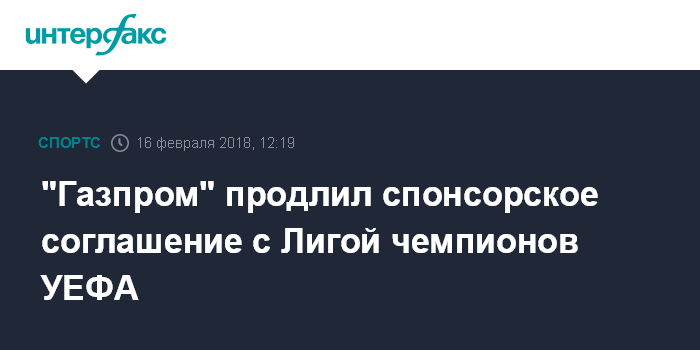 Москва. 16 февраля. INTERFAX.RU - Союз европейских футбольных ассоциаций (УЕФА) объявил о продлении соглашения с компанией "Газпром", сотрудничество которой с Лигой чемпионов продолжится в новом трехлетнем цикле 2018-2021, сообщает пресс-служба УЕФА.