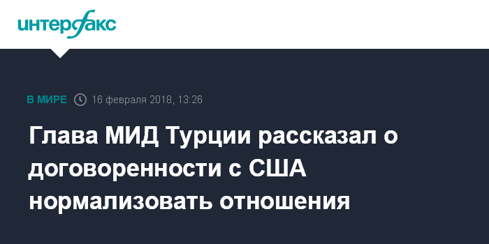 Москва. 16 февраля. INTERFAX.RU - Глава МИД Турции Мевлют Чавушоглу в ходе совместной пресс-конференции с госсекретарем США Рексом Тиллерсоном заявил, что страны договорились нормализовать отношения, сообщают турецкие СМИ.