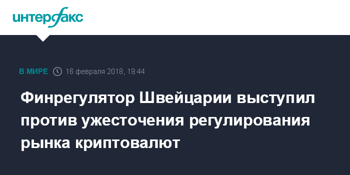Москва. 16 февраля. INTERFAX.RU - Финансовый регулятор Швейцарии (Financial Market Supervisory Authority, FINMA) выступил против глобальной тенденции к ужесточению регулирования сферы криптовалют, опубликовав рекомендации для местных стартапов, планирующих проведение ICO (Initial Coin Offering).