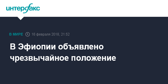 Москва. 16 февраля. INTERFAX.RU - Чрезвычайное положение объявлено в Эфиопии в пятницу, спустя сутки после того, как премьер-министр страны Хайлемариам Десалень заявил об уходе с поста. Об этом сообщает межарабский телеканал Al Jazeera.