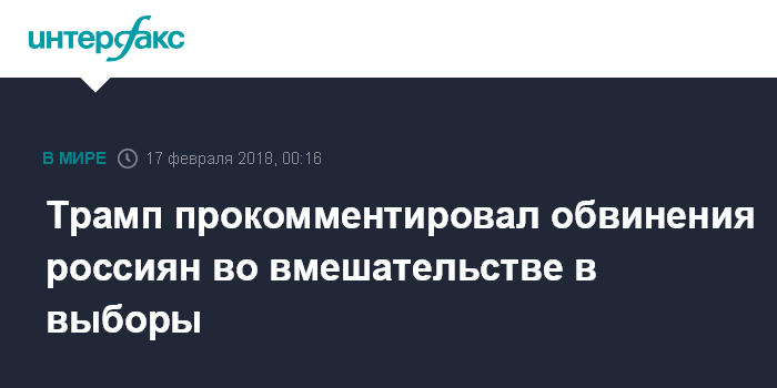 Москва. 17 февраля. INTERFAX.RU -Президент США Дональд Трамп заявил, что выдвинутые Минюстом обвинения в отношении 13 россиян во вмешательстве в американские выборы показывают, что его предвыборная кампания не сделала ничего плохого.