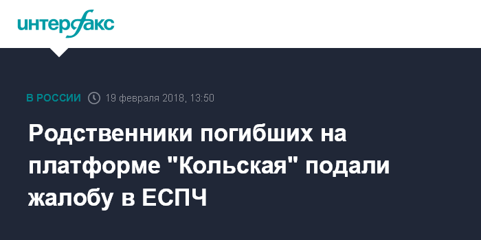 Москва. 19 февраля. INTERFAX.RU - Родные погибших на самоподъемной плавучей буровой установке "Кольская" (СПБУ, судовладелец ОАО "Арктикморнефтегазразведка", АМНГР) в Охотском море в декабре 2011 года подали жалобу в Европейский суд по правам человека. Об этом сообщила вдова старшего механика СПБУ "Кольская" Ильи Карташева Елена Богуш.