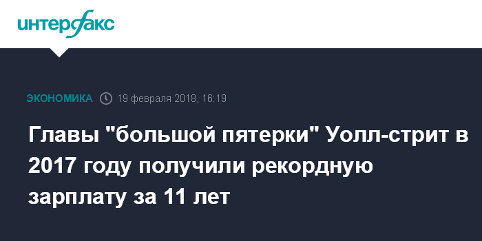 Москва. 19 февраля. INTERFAX.RU - Зарплата и бонусы глав пяти крупнейших банков Уолл-стрит (JPMorgan Chase, Goldman Sachs, Citigroup, Morgan Stanley и Bank of America) в 2017 году выросли по итогам пятого года подряд и составили в совокупности рекордные с 2006 года $126 млн, пишет Dow Jones.
