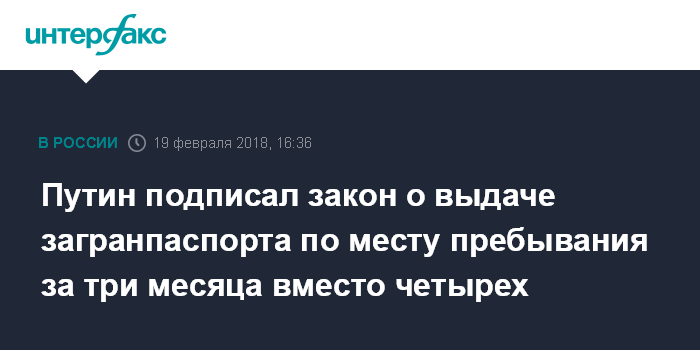 Москва. 19 февраля. INTERFAX.RU - Президент России Владимир Путин подписал закон о сокращении с четырех до трех месяцев сроков выдачи загранпаспорта в случае получения его по месту пребывания гражданина. Соответствующий закон опубликован в понедельник на Официальном интернет-портале правовой информации.