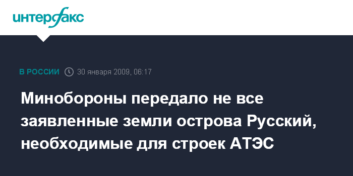 Владивосток. 30 января. ИНТЕРФАКС - ДАЛЬНИЙ ВОСТОК - Министерство обороны отказалось от части земли на острове Русский во Владивостоке, необходимой для строительства объектов саммита АТЭС-2012.