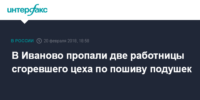 Москва. 20 февраля. INTERFAX.RU - Сотрудники полиции Ивановской области устанавливают местонахождение двух женщин из числа сотрудниц производственного цеха в Иваново, где во вторник произошел пожар. Об этом сообщил "Интерфаксу" руководитель пресс-службы УМВД по региону Владислав Радостин.