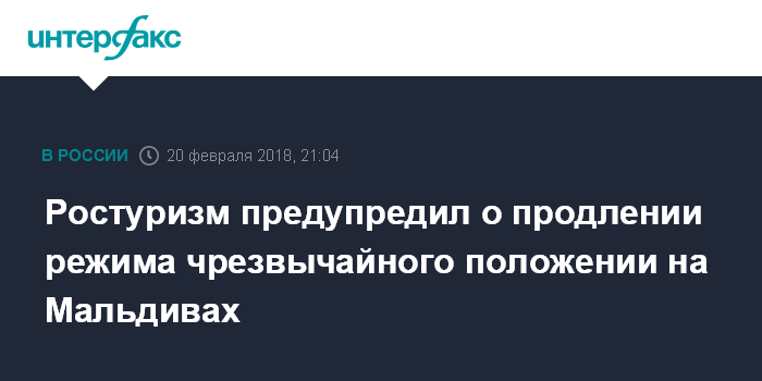 Москва. 20 февраля. INTERFAX.RU - Ростуризм снова рекомендовал российским туристам взвешивать необходимость поездок на Мальдивские острова в связи с тем, что чрезвычайное положение там продлено на 30 дней.