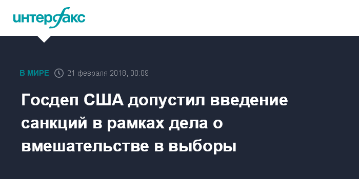 Москва. 20 февраля. INTERFAX.RU - Госдепартамент не исключает возможность введения санкций в отношении 13 россиян, против которых Минюст США ранее выдвинул обвинения по делу о вмешательстве в президентские выборы 2016 года.