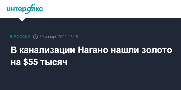 Москва. 30 января. INTERFAX.RU - В сточной трубе японского города Нагано среди нескольких тонн нечистот были обнаружены частицы золота общей стоимостью $55,555 тыс., сообщил в четверг агентству ЭФЭ представитель службы, занимающейся очисткой вод.
