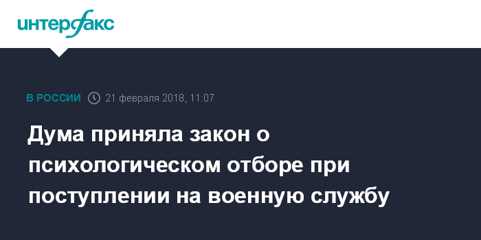 Москва. 21 февраля. INTERFAX.RU - Госдума приняла в третьем, окончательном чтении закон о проведении психологического отбора граждан РФ при призыве на военную службу, в войска Росгвардии, при поступлении в военные профессиональные образовательные организации, а также проведении психологического отбора российских и иностранных граждан при поступлении на военную службу по контракту.
