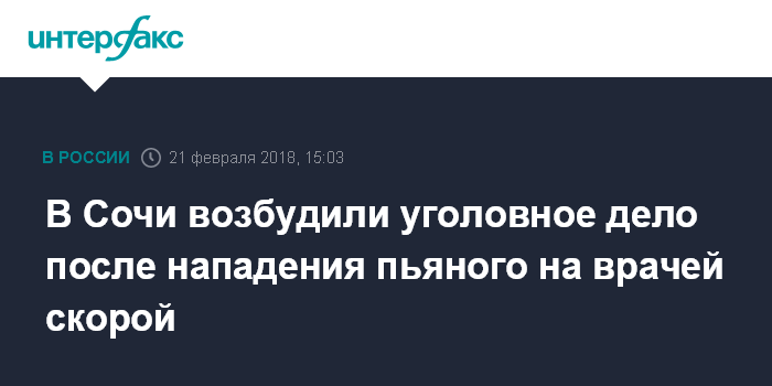 Москва. 21 февраля. INTERFAX.RU - Возбуждено уголовное дело в отношении жителя Сочи, подозреваемого в нападении на работников скорой медицинской помощи, сообщает пресс-служба следственного управления СКР по Краснодарскому краю в среду.