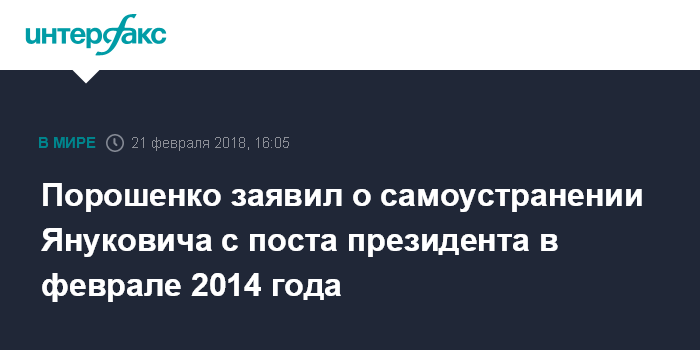 Москва. 21 февраля. INTERFAX.RU - Полномочия экс-президента Украины Виктора Януковича не были досрочно прекращены в феврале 2014 года, а возложены на тогдашнего председателя Верховной Рады Александра Турчинова в связи с самоустранением Януковича, отмечает действующий президент Украины Петр Порошенко.