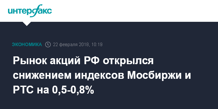 Москва. 22 февраля. INTERFAX.RU - Рынок акций РФ открылся в четверг снижением цен blue chips на фоне отката нефти и мировых фондовых площадок после выхода протокола январского заседания Федрезерва США; индексы МосБиржи и РТС за минуту торгов просели на 0,5-0,8%.