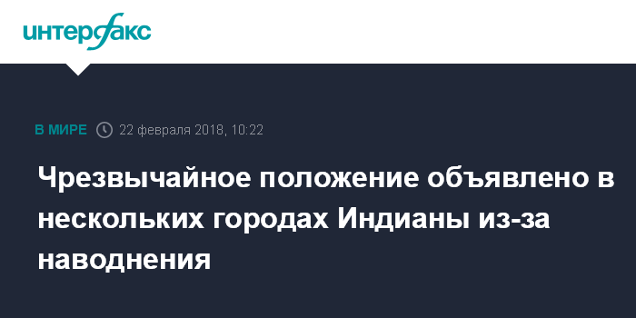 Москва. 22 февраля. INTERFAX.RU - Сотрудники спасательных служб эвакуируют жителей нескольких городов американского штата Индиана в связи с наводнением, вызванным сильными ливнями и таянием снега, сообщает в четверг агентство Associated Press.
