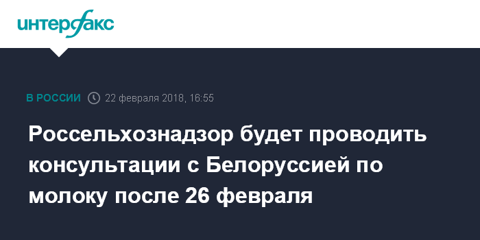 Как сообщалось, Россия с 26 февраля запрещает поставки из Белоруссии пастеризованного, стерилизованного и ультрапастеризованного молока и сливок наливом, сухих, концентрированных, консервированных и сгущенных молока и сливок, молочной наливной, концентрированной и сухой сыворотки, а также сывороточного концентрата и молочного белка.