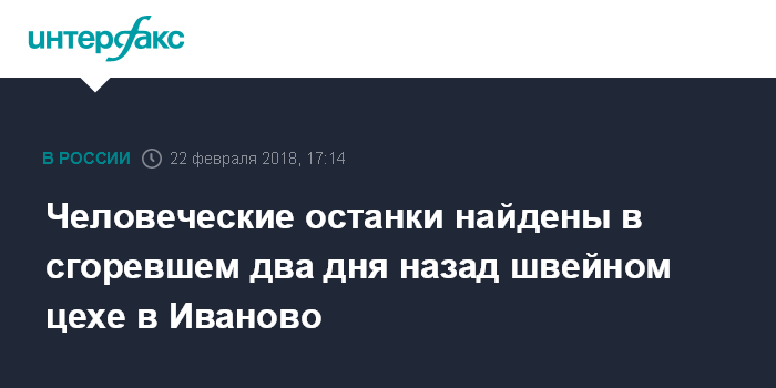 Москва. 22 февраля. INTERFAX.RU - На месте пожара в швейном цехе в Иваново, который произошел 20 февраля, обнаружены останки человека, сообщили "Интерфаксу" в пресс-службе следственного управления СКР по региону.