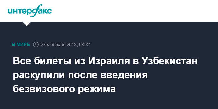 Москва. 23 февраля. INTERFAX.RU - После введения безвизового режима для израильских граждан за два дня были раскуплены все билеты из Израиля в Узбекистан до июня. Такая информация была озвучена накануне на совещании под председательством президента Узбекистана Шавката Мирзиеева, сообщили в четверг узбекские СМИ.