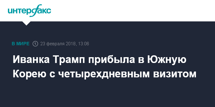Москва. 23 февраля. INTERFAX.RU - Советник президента США Иванка Трамп прибыла в Южную Корею, где встретится с президентом страны Мун Чжэ Ином и посетит церемонию закрытия Олимпийских игр в Пхенчхане, сообщает в пятницу "Ренхап".