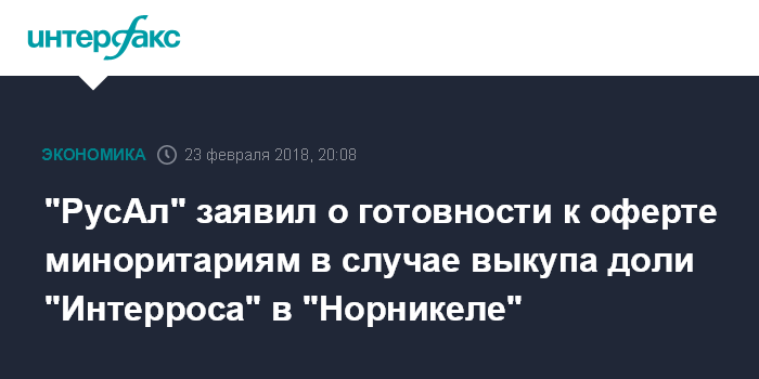 "РусАл" заявил о готовности к оферте миноритариям в случае выкупа доли "Интерроса" в "Норникеле"