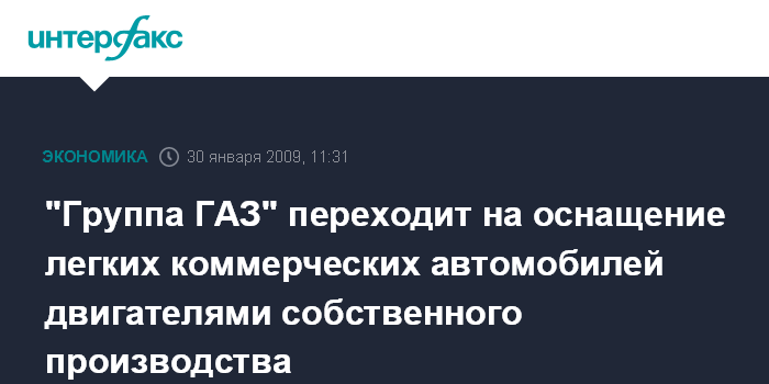 Москва. 30 января. INTERFAX.RU - "Группа ГАЗ" в 2009 году переходит на оснащение легких коммерческих автомобилей двигателями собственного производства, что позволит снизить отпускную цену на автомобили "Газель" на 10%, говорится в пресс-релизе группы.