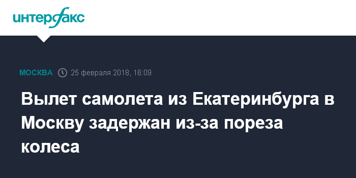 Москва. 25 февраля. INTERFAX.RU - В аэропорту "Кольцово" в Екатеринбурге на несколько часов задерживается вылет самолета авиакомпании "Победа" в Москву из-за неисправности колеса.