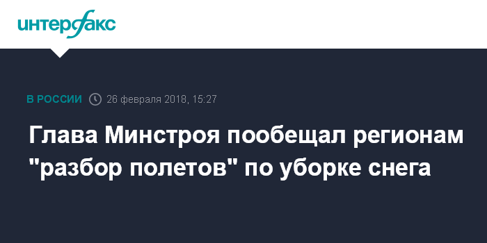 Москва. 26 февраля. INTERFAX.RU - Минстрой России летом проведет анализ работы регионов по уборке снега, сообщил в понедельник в интервью телеканалу НТВ глава ведомства Михаил Мень.